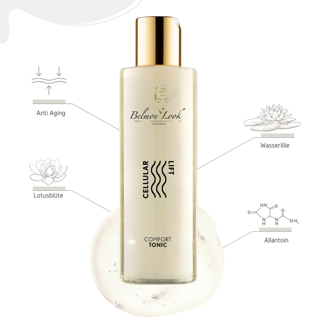 REVITALIZING! Comfort Tonic aus unserer Cellular Lift Serie ist ein wichtiger Step der ergebnisorientierten Anti-Aging-Pflege mit Naturkosmetik. Sie reinigt gründlich, belebt und verleiht der Haut eine neue Vitalität. Angereichert mit hochwirksamen Inhaltsstoffen bietet das luxuriöse Anti-Aging Gesichtstonic von Belmon Look eine sanfte Reinigung, was die Haut effektiv von Unreinheiten befreit und gleichzeitig erfrischt. Durch seine einzigartige Formel regt das Tonic den Kollagenaufbau an um die Hautelastizität zu verbessern und feine Linien und Falten zu reduzieren. Gleichzeitig verleiht es der Hautstruktur neue Vitalität und Frische. Comfort Tonic - für einen strahlenden Teint und eine jugendliche Ausstrahlung.